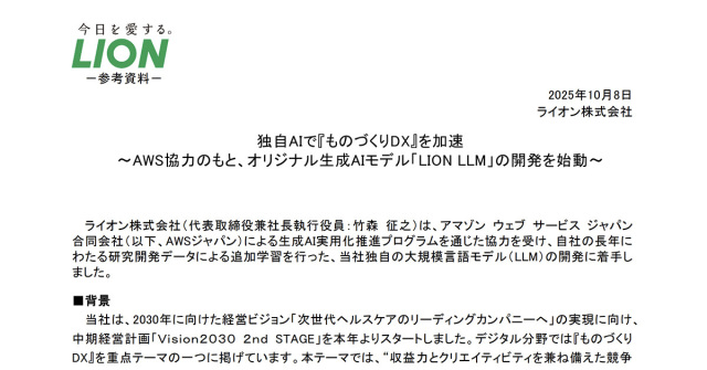 ライオンは、自社の研究開発データを活用した大規模言語モデル(LLM)の「LION LLM」の開発に着手したと発表した。アマゾン ウェブ サービス ジャパン(以下、AWSジャパン)の生成AI実用化推進プログラム協力の下、ものづくり分野におけるデジタルトランスフォーメーション(DX)の推進を目的とした取り組みとされている。