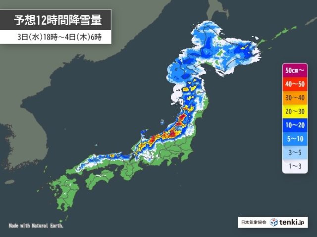 一回目の雪のピークは今夜(3日)から明日(4日)朝にかけてです。東北や北陸は大雪の恐れがあり、山沿いでは多い所で50センチ以上のドカ雪が予想されています。風も吹き荒れるため、吹雪で見通しが悪くなることも予想されます。不要不急の外出は控えたほうがよさそうです。