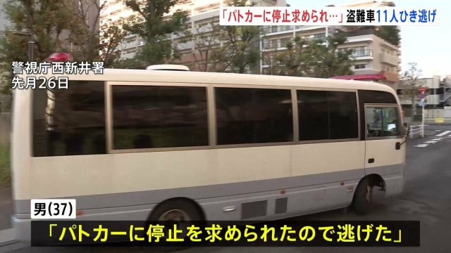 東京・足立区で乗用車が歩行者をはね、11人が死傷したひき逃げ事件で、事件を起こした車を盗んだとして逮捕された男が「パトカーに停止を求められたので逃げた」という趣旨の供述をしていることがわかりました。