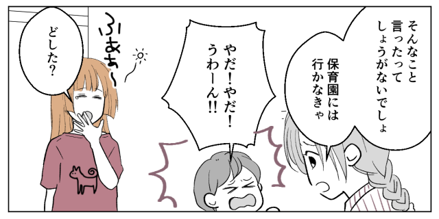 最近は甥っ子に朝から「ミアに『行ってきます』を言う!」と起こされることが多くなり、私も以前より朝型になってきました。ある雨の日。私が起きると、保育園に行きたがらない甥っ子に姉が困り果てていました。