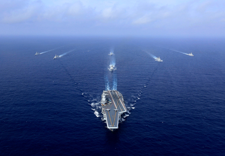 中国海軍の空母「遼寧」(中央)=2018年4月(AFP時事) 中国軍機による自衛隊機へのレーダー照射問題で、防衛省は9日、中国海軍の空母「遼寧」が新たに補給艦を合流させ、沖ノ鳥島(東京都)北側の海域を航行しているのを確認したと発表した。1カ月程度の長期行動が可能になったとみられ、同省は空自機を緊急発進させるなどして、警戒監視と情報収集を進めている。