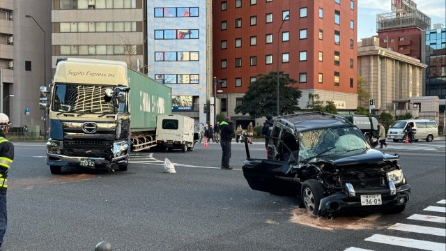 午前5時半すぎ、横浜市中区本町で「大型トラックと乗用車2台が絡む事故があり、2人が挟まっている」と通行人から119番通報がありました。