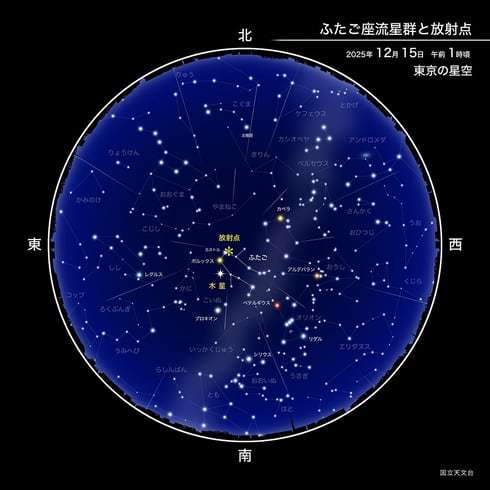 国立天文台によると、最も多く流れ星が見られる“極大”は12月14日の午後5時。14日の午後11時から15日午前2時頃にかけては、1時間に50個程度の流星が見られる可能性もあるという。
