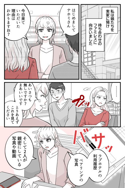 実家に娘たちを預け、ファミレスでユウスケとナホミと対峙することになりました。不倫の証拠を突きつけると、ユウスケは相変わらず言い訳を重ねます。