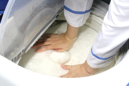 次に、毛布コースや大物洗いコースを選択し、洗濯機の表示に従っておしゃれ着用洗剤を洗剤投入口にセットする。水に浮きやすく浸らないことがあるため、縦型洗濯機の場合は水が溜まったら一時停止し、両手で5〜6回程度押し沈めてから洗濯を開始する。