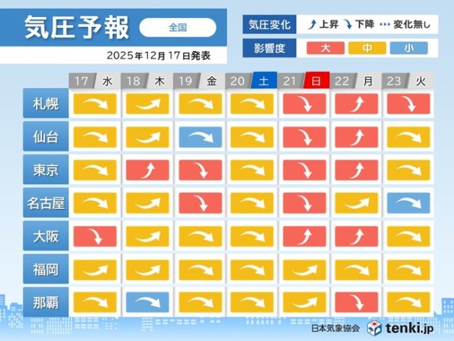 今日17日(水)は北海道から近畿、沖縄は気圧が低下。明日18日(木)以降も気圧のアップダウンが激しく、特に21日(日)は北海道から近畿にかけての広い範囲で影響度が大きくなりそうです。その後も気圧が上がったり下がったりするため、頭痛やめまいなど体調にご注意ください。