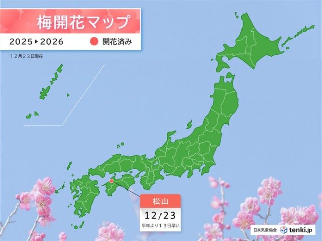 今日23日(火)、愛媛県松山から今シーズン(2025-2026年)全国で初めてウメの開花の便りが届きました。平年より13日早く、昨年より28日早い観測です。