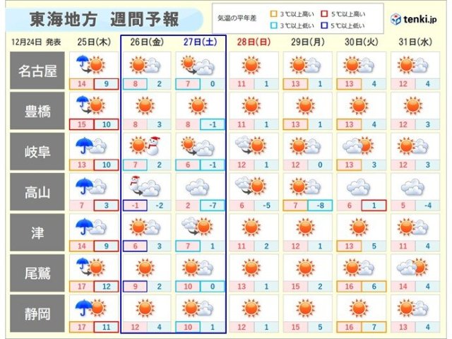 東海地方は、明日25日(木)にかけて雨が降りやすく、傘が手放せないでしょう。26日(金)は、この冬一番の強い寒気の影響で、厳しい寒さとなる見込みです。岐阜県山間部は、一気に積雪が急増する恐れがあります。