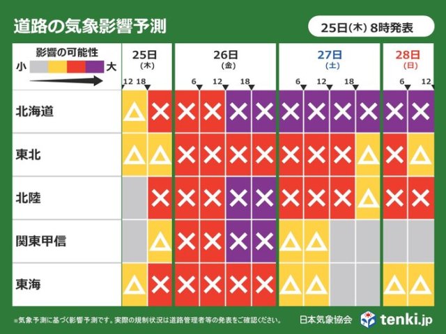 ※道路ごとの影響については、道路の気象影響予測も参考になさってください。(気象予測に基づく影響予測ですので、実際の規制状況は道路管理者等の発表をご確認ください。)