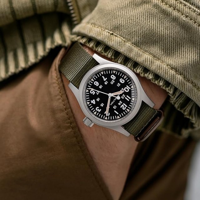 ミリタリー由来のカーキ フィールドは、視認性と耐久性に優れた実用派モデル。曜日・日付表示付きで、毎日使う時計としてのバランスが良い。
