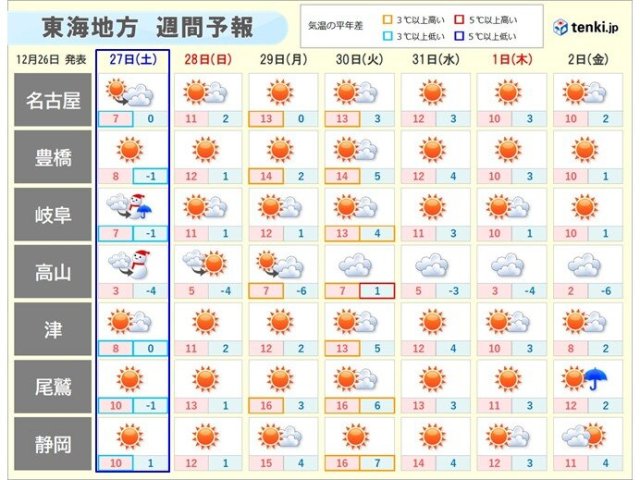 明日27日(土)も、寒気の影響が続くでしょう。朝の最低気温は、岐阜で氷点下1℃、名古屋と津で0℃、静岡で1℃の予想です。山間部だけでなく平野部でも、氷点下の冷え込みとなる所が多くなりそうです。積雪のある地域では、路面の凍結に十分注意してください。日中もあまり気温が上がらず、最高気温は名古屋と岐阜で7℃、津で8℃、静岡で10℃の予想です。強い風は収まるものの、空気は冷たいままでしょう。暖かくしてお過ごしください。