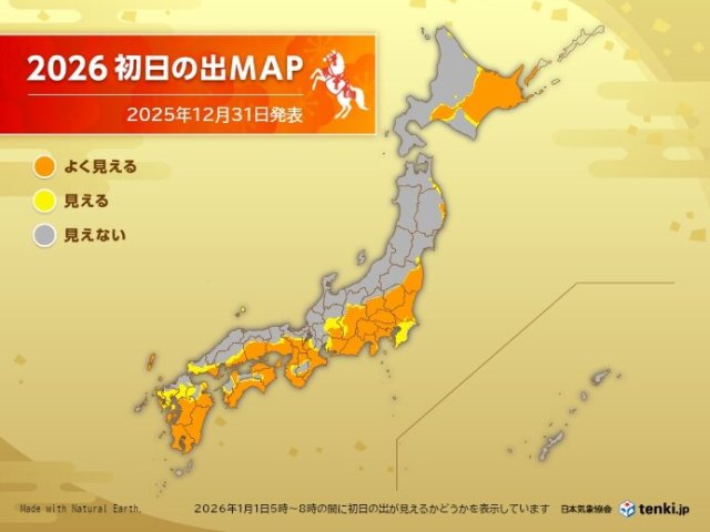 2026年の幕開けを飾る「初日の出」。2026年1月1日の朝は、太平洋側でも雲の広がる所がありますが、北海道の東部や関東から九州では「初日の出」を拝める所が多くなりそうです。気になる各地の天気や「初日の出」の時刻をまとめました。
