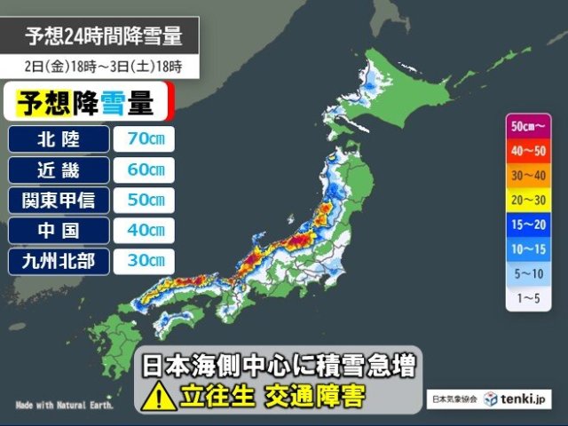 日本海側を中心に雪が降り続いていますが、今夜から明日にかけて東京都心でも雪が降りそうです。また、明日3日(土)の夕方までに北陸の多い所ではさらに70センチの雪が降ることが予想されます。Uターンの足にも影響が出る恐れがありますので、ご注意ください。