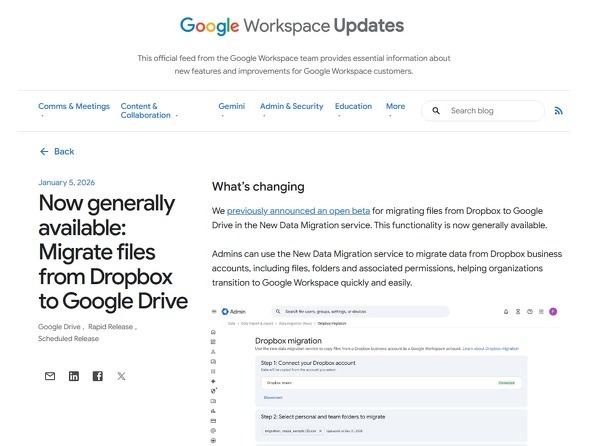 Googleは1月5日、クラウドストレージ「Dropbox」からGoogleドライブにデータを移行する機能を正式にリリースした。本機能は2025年11月よりオープンβ版として提供されていた。