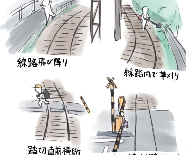 「線路飛び降り」「線路内で草刈り」「踏切直前横断」「踏切待ち(踏切内)」「線路横断(勝手踏切)」などのイラストが描かれていましたが、こういった場面に出くわすことはめずらしくないのですか?