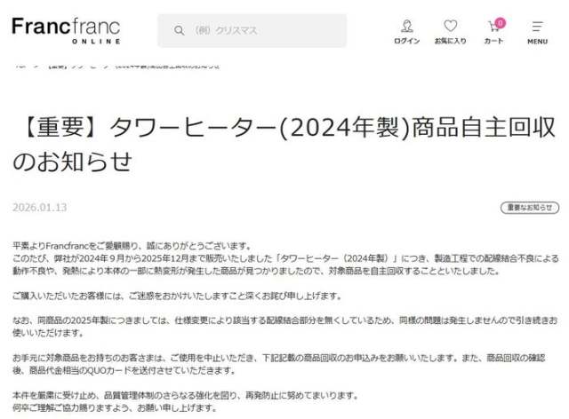 同社は「このたび、弊社が2024年9月から2025年12月まで販売いたしました『タワーヒーター(2024年製)』につき、製造工程での配線結合不良による動作不良や、発熱により本体の一部に熱変形が発生した商品が見つかりましたので、対象商品を自主回収することといたしました」と報告。「ご購入いただいたお客様には、ご迷惑をおかけいたしますこと深くお詫び申し上げます」と謝罪した。