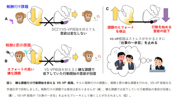 嫌な仕事をなかなか始められない状態を引き起こす脳の神経回路を解明したと、京都大学らの研究チームが発表した。脳深部にある「腹側線条体」と「腹側淡蒼球」を結ぶ神経経路が、ストレスのかかる課題に対して「やる気ブレーキ」として働いているという。