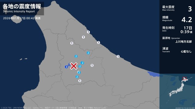 気象庁によりますと、震源地は上川地方北部で、震源の深さはごく浅い、地震の規模を示すマグニチュードは4.2と推定されます。