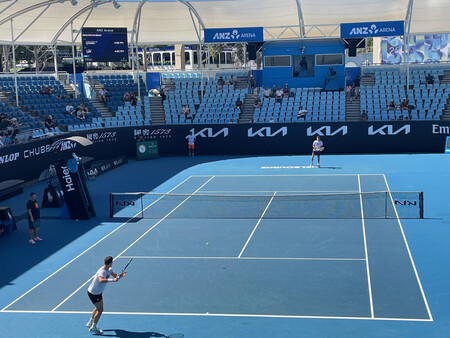 全豪オープンテニスの選手が練習する「ANZアリーナ」=17日、オーストラリア・メルボルン 【メルボルン時事】オーストラリア南東部メルボルンで18日開幕する全豪オープンテニスの会場内のコートの一つが、今年から地元の大手銀行オーストラリア・ニュージーランド銀行(ANZ)にちなんだ「ANZアリーナ」に改称された。昨年まで「第3コート」と呼ばれていたが、ANZがスポンサー契約の更新に伴い命名権を得た。