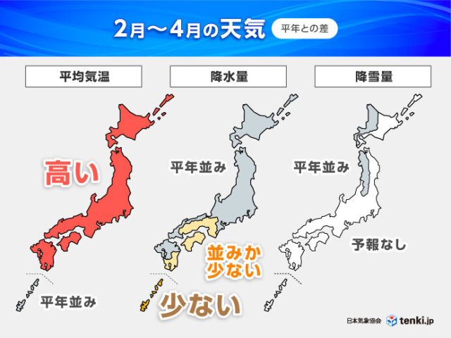 最新の3か月予報によると、2月は全国的に気温が平年並みで冬らしい厳しい寒さの日が多いでしょう。3月と4月は平年より高い所が多く、春の訪れは早くなりそうです。花粉は3月にピークを迎えるでしょう。低気圧の影響を受けにくい時期があるため、向こう3か月の降水量は、沖縄・奄美では少なく、西日本太平洋側では平年並みか少ないでしょう。