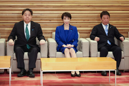 閣議に臨む高市早苗首相(中央)ら=23日午前、首相官邸 政府は23日の閣議で、外国人労働者の在留資格「特定技能」と、技能実習に代わる新制度「育成就労」の分野別運用方針を決定した。深刻な人手不足に対応するため、2028年度末までの5年間の受け入れ上限数を、計123万1900人に設定。対象分野に「リネンサプライ」「物流倉庫」「資源循環」を追加した。