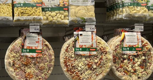 日本でもよく見るようなつり下げタイプの陳列棚が写されており、パスタやピザ、加工されたサーモンなど、たくさんの商品が並んでいるのですが、よく見ると商品のパッケージに“目のシール”が貼られていました。なんで……?