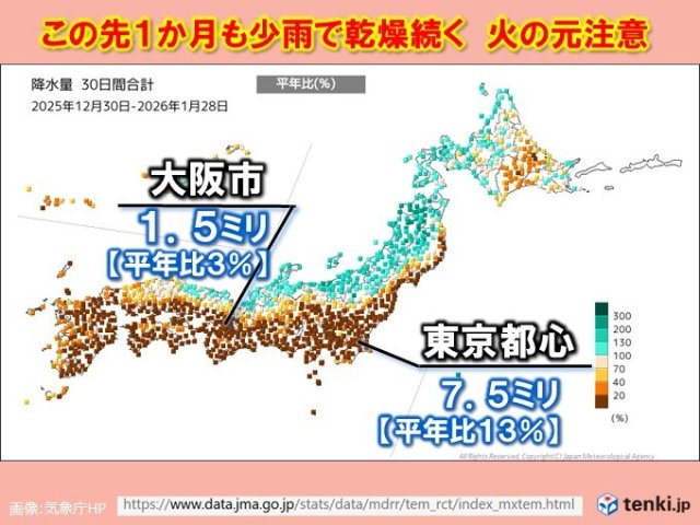 太平洋側は11月中旬頃から、降水量の少ない状態が続いています。渇水が続く中、この先1か月の降水量は、東日本や西日本の太平洋側ほど平年並みか平年よりも少ない見込みです。晴れて空気の乾燥が続きますので、火の取り扱いには十分注意し、日頃から水も大切に使用するように心がけましょう。