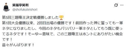 上方落語の笑福亭笑利(42)が31日までにX(旧ツイッター)を更新。30日に大阪・天満天神繁昌亭で開催された「第5回三題噺王決定戦」で優勝したことを報告した。