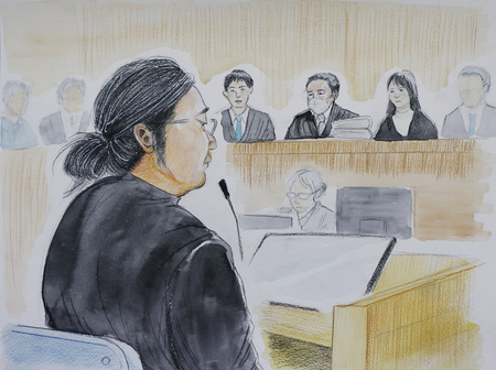 奈良地裁の判決を聞く山上徹也被告(手前)=1月21日(イラスト・松元悠氏) 奈良市で2022年、参院選の応援演説中だった安倍晋三元首相が手製銃で殺害された事件で、山上徹也被告(45)の弁護人は4日、無期懲役とした奈良地裁判決を不服として大阪高裁に控訴した。