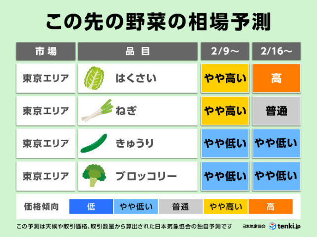 2月9日の週から16日の週にかけての野菜の相場予測を発表しました。東京エリアでは、きゅうりやブロッコリーの価格がやや低めで安定する見込みです。一方で、はくさいやねぎはやや高く、16日の週からは、はくさいが高騰するでしょう。