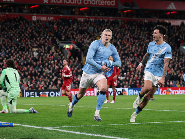 土壇場PK弾で逆転勝利に導いたハーランド[写真]=Getty Images プレミアリーグ第25節が8日に行われ、MF遠藤航が所属するリヴァプールとマンチェスター・シティが対戦した。
