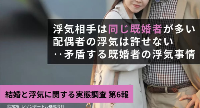 浮気相手と出会った場所をみると、相手が既婚者か独身かで傾向に違いがみられた。特に「昔からの知人・友人」では、浮気相手が既婚者だった割合が30.5%と、独身の16.8%を大きく上回った。また、「教室・稽古など学びの場」でも、既婚者が7.6%、独身が2.2%と、既婚者の割合が2倍以上となった。同世代で立場が近く、秘密を共有しやすい関係性が、既婚者同士の浮気につながりやすいことがうかがえる。