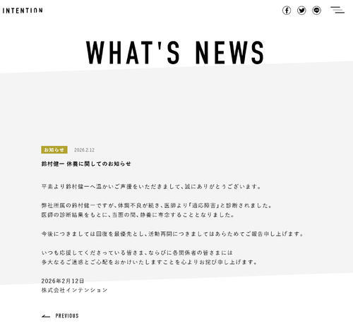公式サイトに「鈴村健一休養に関してのお知らせ」と題した文書を発表。「弊社所属の鈴村健一ですが、体調不良が続き、医師より『適応障害』と診断されました。医師の診断結果をもとに、当面の間、静養に専念することとなりました。今後につきましては回復を最優先とし、活動再開につきましてはあらためてご報告申し上げます」とした。