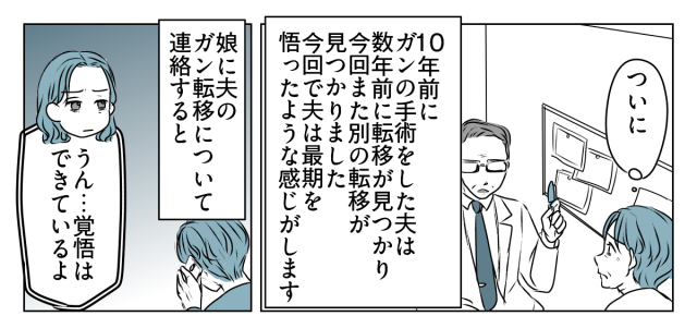 医師から夫のガンの転移を告げられ「またか」と「ついに」という気持ちがわいてきました。今回は夫の雰囲気が今までと違い、最期を悟ったような感じがしました。夫のガン転移について娘に連絡すると、冷静な受け答えをしていました。