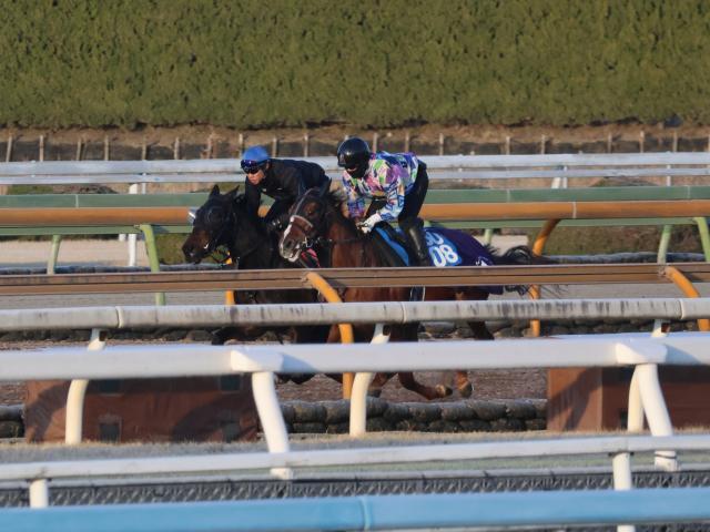 今回コンビを組む、武豊騎手が跨ってのCWでの併せ馬。馬場に入ってから1コーナー、2コーナーとヤマニンシュラを追走していたが、注目の折り合いに関しては行きたがったりするようなところはない。