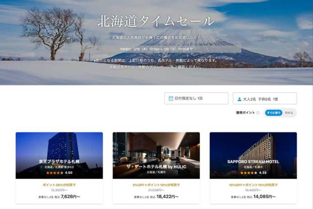 一休は、宿泊予約サイト「一休.com」で、「北海道タイムセール」を、2月19日正午から3月9日正午まで開催している。