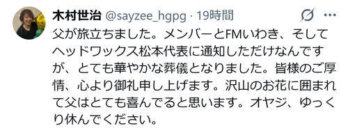 木村は「父が旅立ちました」と報告。「メンバーとFMいわき、そしてヘッドワックス松本代表に通知しただけなんですが、とても華やかな葬儀となりました。皆様のご厚情、心より御礼申し上げます」と、メンバーや、自身がパーソナリティーを務めるラジオ番組の関係者、自身を見いだした恩人でもある元X JAPANのhideさんの事務所代表らに感謝した。
