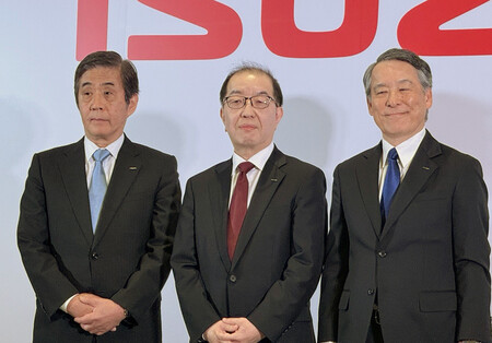 記者会見後に撮影に応じるいすゞ自動車の山口真宏次期社長(中央)と片山正則会長(左)、南真介社長=27日午後、東京都千代田区 いすゞ自動車は27日、山口真宏専務が社長に昇格する人事を発表した。南真介社長は代表権のない副会長に就く。ともに4月1日付で、社長交代は2023年以来3年ぶり。新たな経営体制の下、自動運転の事業化や電動化への移行を急ぐ。