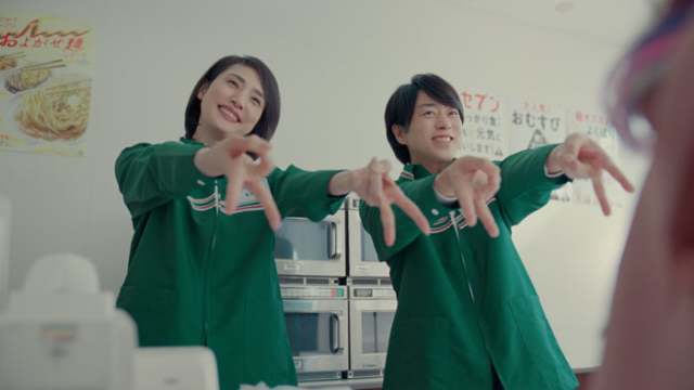 商品棚を見渡しながら、朝から元気いっぱいな客役の荒川が「新メニュー、いろいろ増えました?」と声をかけると、オーナー役の天海が「そうなんです!」と明るく応える。続いて櫻井も「ガブッとサンド、大人気なんです!」と商品をおすすめする。そのやり取りに荒川は思わず「朝セブン、最高〜!」と声をあげ、ギャルピース。つられて櫻井と天海も同じポーズを取り、店内は朝からノリのよい空気に包まれる。そんな声に反応して、相葉がレジの奥からひょっこり顔を出し、「おはようございます!」と爽やかに挨拶。その笑顔に、荒川は思わず「みつけた」とつぶやくが、相葉は気づかないまま、別の客にも同じように挨拶する。
