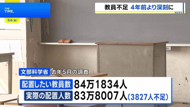 「教員不足」4年前よりも深刻に 配置したい教員数に対し3827人不足 文部科学省が調査