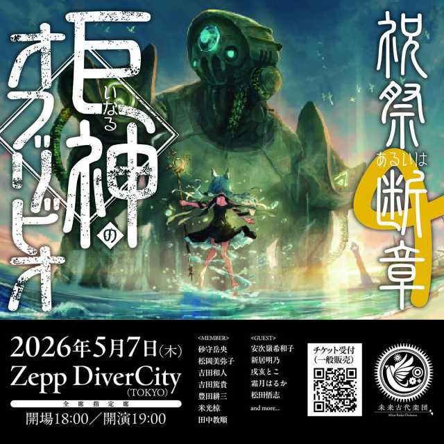 画像提供:マイナビニュース代表曲「忘れじの言の葉」(スクウェア・エニックス『グリムノーツ』主題歌)などで国内外から高い評価を受ける音楽ユニット「未来古代楽団」が2026年5月7日(木)にZepp DiverCityで開催するワンマン公演「祝祭あるいは断章6『巨いなる神のオブリビオ(おおいなるかみのおぶりびお)』」のチケット一般発売が本日2026年3月7日(土)よりスタートした。