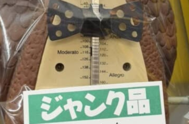 今回、ツシマさんが投稿したのはハードオフで見掛けたジャンク品です。そのジャンク品は……フクロウの形をしたメトロノームでした! 大きな目がぱっちりしている茶色のフクロウの形をしており、振り子の遊錘(おもりの部分)がリボンになっているというレトロかわいいデザインです。