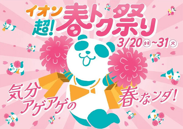 イオン・イオンスタイル直営売場で税込3,000円以上の当日レシートを提示するとノベルティがもらえる。5色のカラーバリエーションの中からランダムで1人1つ進呈し、無くなり次第終了となる。3月21日からは「mojojojoコラボ チアパンダBIGエコバッグ」、3月28日からは「mojojojoコラボ チアパンダトラベルポーチ 3点セット」を配布する。(Yumi's life)