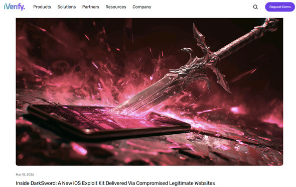 ¡¡ÊÆApple¤ÎiPhone¤«¤é¿¯Æþ¤·¤Æ¾ðÊó¤òÅð¤ß½Ð¤¹¶¯ÎϤʥ¨¥¯¥¹¥×¥í¥¤¥È¤¬¡¢¥¦¥¯¥é¥¤¥Ê¤ÎÊ£¿ô¤ÎWeb¥µ¥¤¥È¤Ë»Å³Ý¤±¤é¤ì¤Æ¤¤¤¿¤È¡¢ÊÆGoogle¤äÊÆiVerify¡¢ÊÆLookout¤Î¸¦µæ¼Ô¤é¤¬3·î18Æü¡ÊÊÆÂÀÊ¿Íλþ´Ö¡Ë¤Ëȯɽ¤·¤¿¡£¤³¤Î¥¨¥¯¥¹¥×¥í¥¤¥È¥Á¥§¡¼¥ó¤Ï¡ÖDarkSword¡×¤È̾ÉÕ¤±¤é¤ì¤Æ¤ª¤ê¡¢¹¶·â¼Ô¤ÏÀ¯Éܵ¡´Ø¤ä¥Ë¥å¡¼¥¹¥µ¥¤¥È¤Ê¤ÉÀµµ¬¤ÎWeb¥µ¥¤¥È¤ò²þ¤¶¤ó¤·¤Æ¡¢°°Õ¤Î¤¢¤ë¸«¤¨¤Ê¤¤iframe¤òËä¤á¹þ¤à¡Ö¿å°û¤ß¾ì·¿¹¶·â¡×¤Î¼êË¡¤òÍѤ¤¤Æ¤¤¤ë¡£