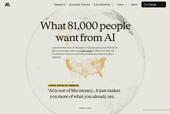 ¡¡ÊÆAnthropic¤Ï3·î18Æü¡Ê¸½ÃÏ»þ´Ö¡Ë¡¢Ìó8Ëü1000¿Í¤ÎClaude¥æ¡¼¥¶¡¼¤òÂоݤË12·î¤Ë¼Â»Ü¤·¤¿AI¤Ë´Ø¤¹¤ë¥¢¥ó¥±¡¼¥ÈÄ´ºº¤Î·ë²Ì¤òÊó¹ð¤·¤¿¡£¤³¤ÎÄ´ºº¤Ï12·î¤Î1½µ´Ö¤Ë¤ï¤¿¤ê¡¢À¤³¦159¥«¹ñ¡¢70¸À¸ì¤Ë¤ï¤¿¤ë8Ëü508¿Í¤Î¥æ¡¼¥¶¡¼¤òÂоݤ˼»ܤµ¤ì¤¿²áµîºÇÂ絬ÌϤο¸À¸ìÄêÀÄ´ºº¤À¡£Ä´ºº¤Ë¤Ï¡¢ÂÐÏ÷¿¤Î¥¤¥ó¥¿¥Ó¥å¡¼¤ò¹Ô¤¦¤è¤¦¥×¥í¥ó¥×¥È¤¬ÀßÄꤵ¤ì¤¿Claude¤ÎÆÃÊ̥С¼¥¸¥ç¥ó¤Ç¤¢¤ë¡ÖAnthropic Interviewer¡×¤¬ÍѤ¤¤é¤ì¤¿¡£AI¤Ëµá¤á¤ë¤³¤È¤äÈò¤±¤¿¤¤¤³¤È¤Ë´Ø¤¹¤ë·è¤Þ¤Ã¤¿¼ÁÌä¤òÅꤲ¤«¤±¤¿¾å¤Ç¡¢²óÅú¤Ë±þ¤¸¤ÆÄɲäμÁÌä¤òŬµ¹ÊѲ½¤µ¤»¤ë¼êË¡¤ò¤È¤ê¡¢¼«Í³²óÅú·Á¼°¤Î¥Ç¡¼¥¿¼ý½¸¤ò¼Â¸½¤·¤Æ¤¤¤ë¡£