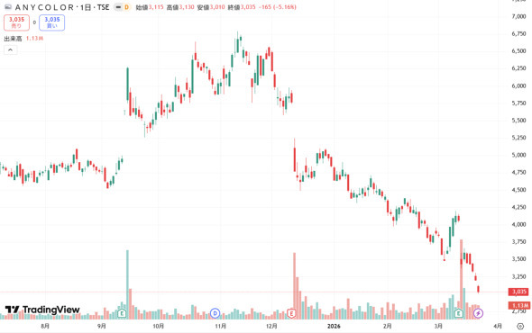 ¡¡¤½¤¦¤Ç¤¢¤ë¤Î¤Ë¤â¤«¤«¤ï¤é¤º¡¢¥¨¥Ë¡¼¥«¥é¡¼¤Î³ô²Á¤Ï¡¢2025ǯ11·î¤Î¹âÃÍ6790±ß¤«¤é2026ǯ3·î23Æü»þÅÀ¤Î½ªÃͤÇ3035±ß¤È¡¢¤ï¤º¤«4¥«·î¤ÇȾÃͤËÄÀ¤ó¤À¡£