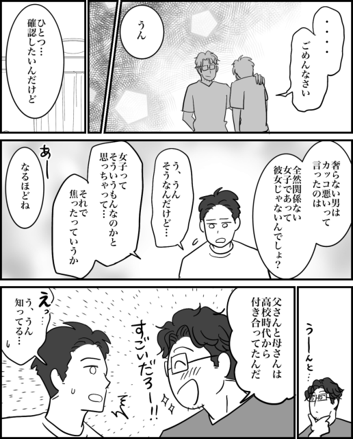 父さんの言葉に打ちのめされ、自分の身勝手さを痛感した俺。サラは「一緒にいられるだけで嬉しい」と言ってくれていたのに……。デートにお金をかけるとか、男が奢ってあげるとかは、それぞれの価値観によるもの。まわりの意見にいちいち振り回されるんじゃなくて、俺とサラで話し合うべきだったのです。