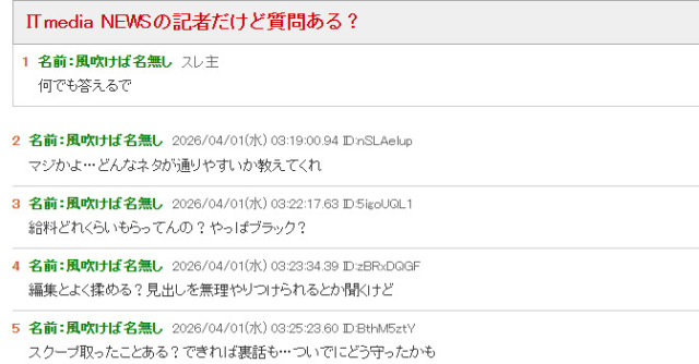 例えばスレタイに「ITmedia NEWSの記者だけど質問ある?」、1コメに「何でも答えるで」と入力すると、数十秒後に「給料どれくらいもらってんの?やっぱブラック?」「SEOのためだけに書いた記事、胸が痛むよな」「ソースの信頼度ってどうやって判断してるの?」といった回答が20件程度生成される。結果は画像として保存可能。サービスは全て無料で利用可能だ。