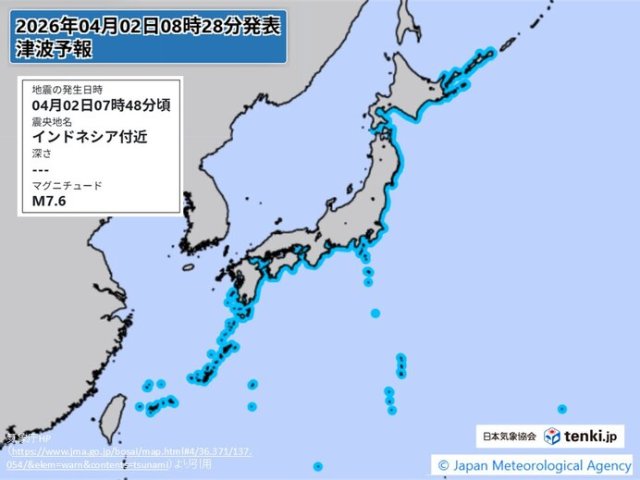 今日2日07時48分頃、インドネシア付近を震源とするマグニチュード7.6と推定される地震がありました。気象庁によりますと、日本では若干の海面変動が予想されますが、被害の心配はありません。若干の海面変動が予想される時刻は、早い沿岸で今日2日10時30分頃です。