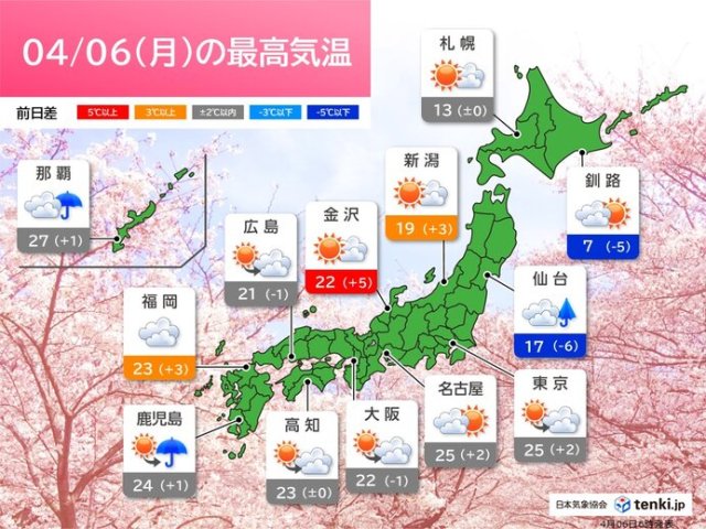 今日4月6日は、高気圧に覆われて、日中は九州〜北海道まで晴れる所が多いでしょう。全国的に最高気温が平年より高く、関東〜九州は暑いくらいの所もありそうです。
